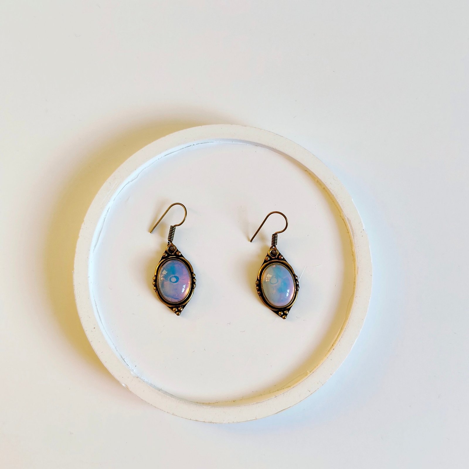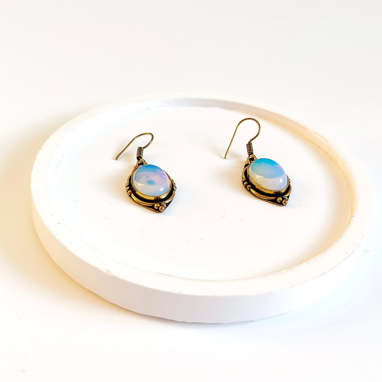 Designed with a vintage-textured antique bronze frame and sparkling opal-effect stone details, these handmade earrings offer an elegant look for both everyday wear and special occasions. The oval-shaped stone captures attention with its shimmering texture, which changes color depending on the light. They’re an ideal accessory choice for those who appreciate authentic, retro, and bohemian styles.