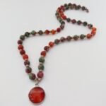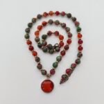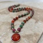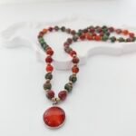 This elegant necklace, designed with the energy of Rhodonite and Carnelian stones, is the perfect choice for achieving both aesthetic and spiritual balance. Rhodonite supports emotional healing, while Carnelian enhances courage and motivation. The necklace, finished with gold-colored beads and natural stones, combines elegance and meaning.