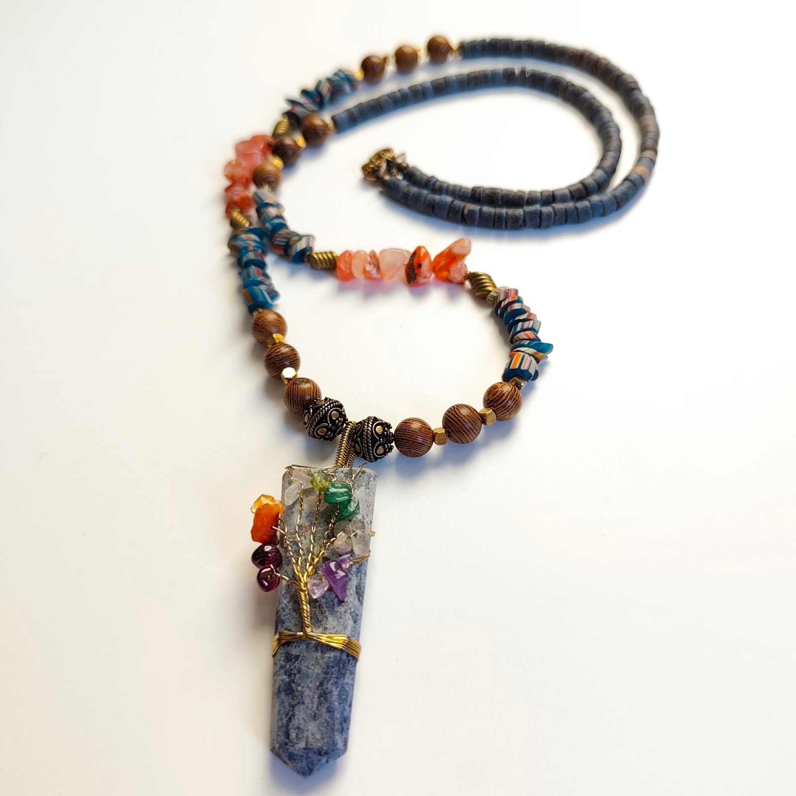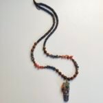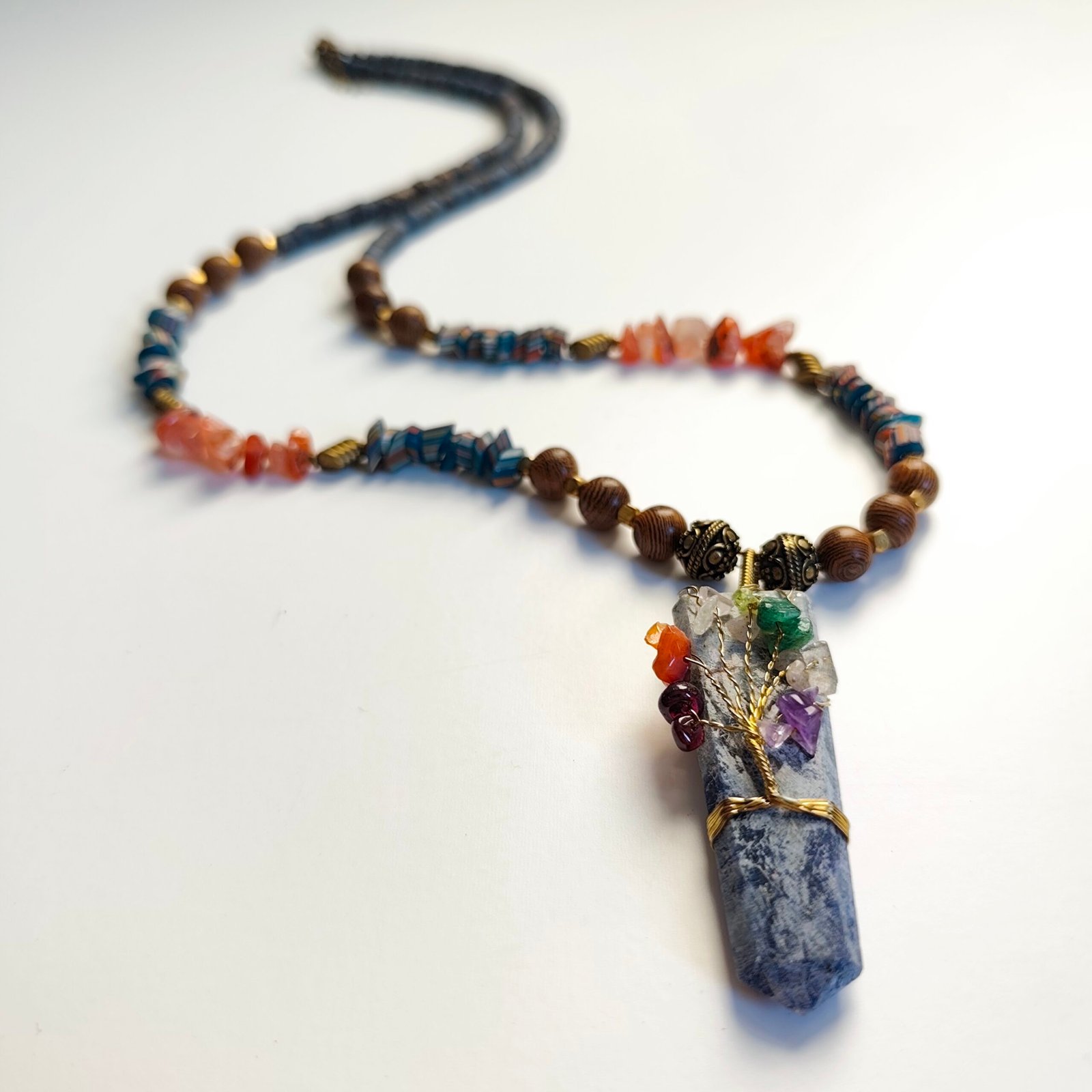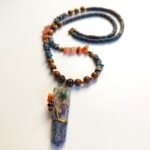 This unique, handmade necklace is designed with natural stones and chic metal details, combining modern and bohemian style. Enriched with chakra stones and natural materials, the necklace offers both aesthetic and energetic benefits.