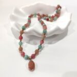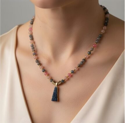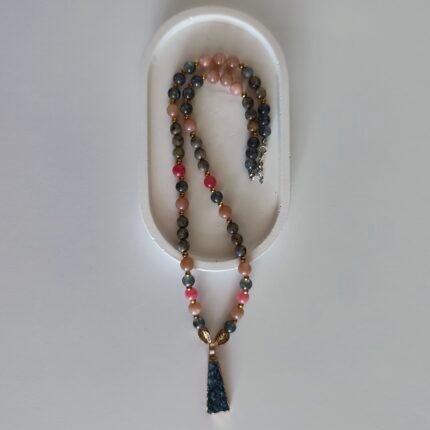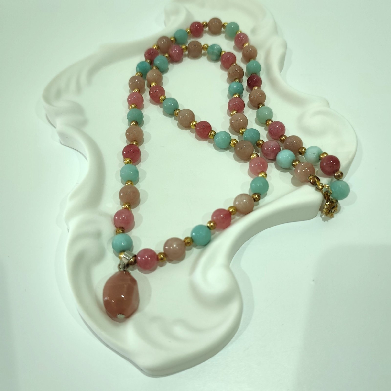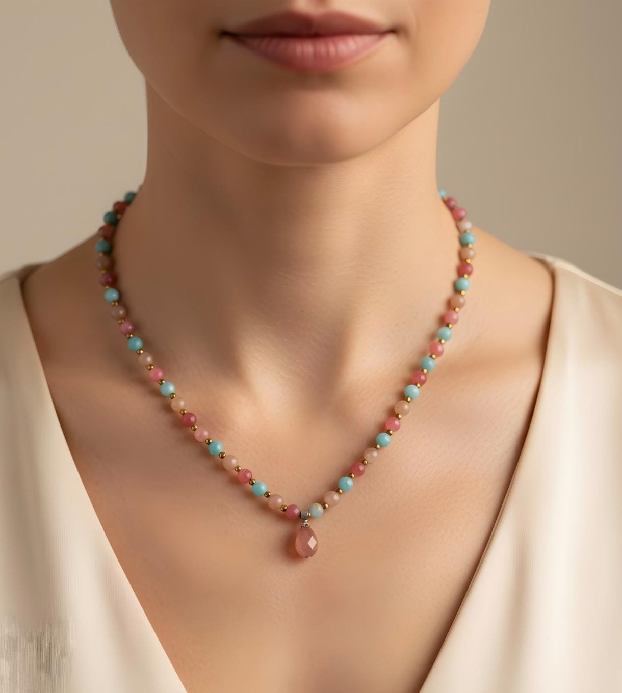 The elegant harmony of Pink Agate and Blue Agate, combined with gold-toned beads, offers elegance and energy. The pendant is made of rose quartz, creating a delicate and elegant look. This necklace, which can be worn comfortably for both daily wear and special occasions, will elevate your style and energy.