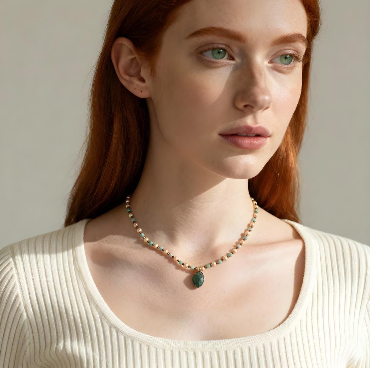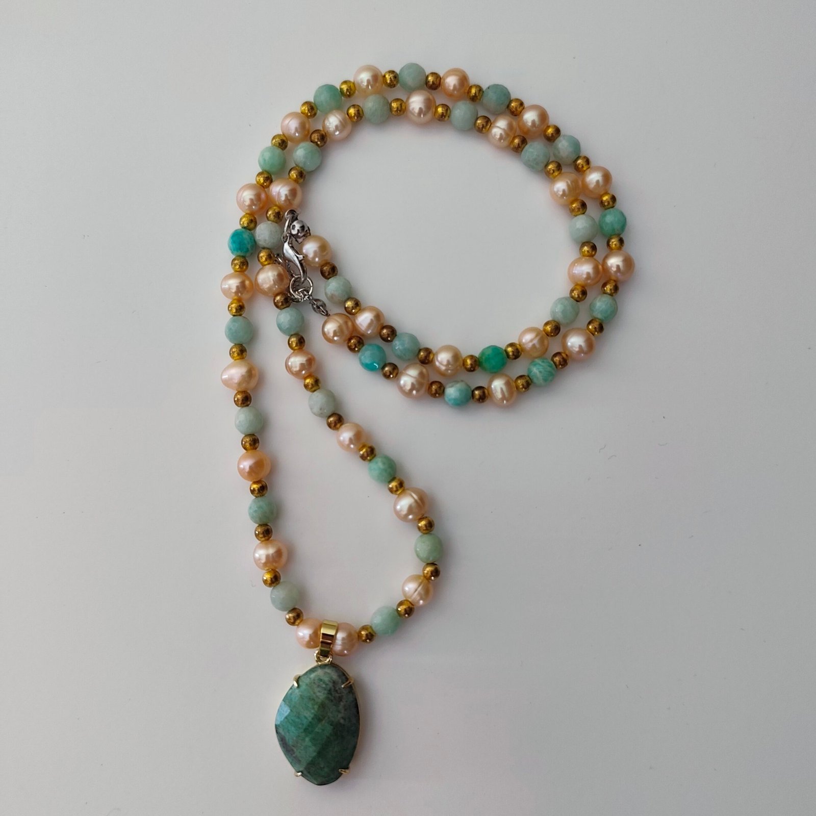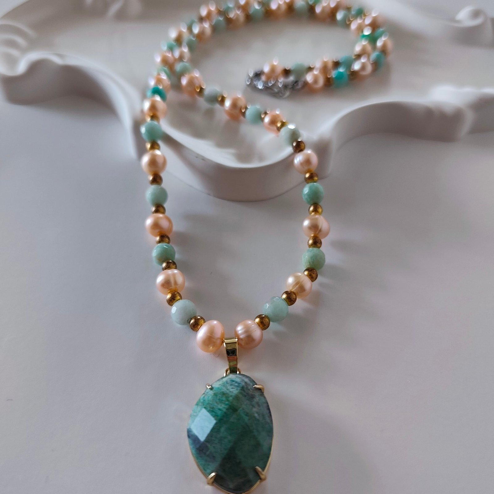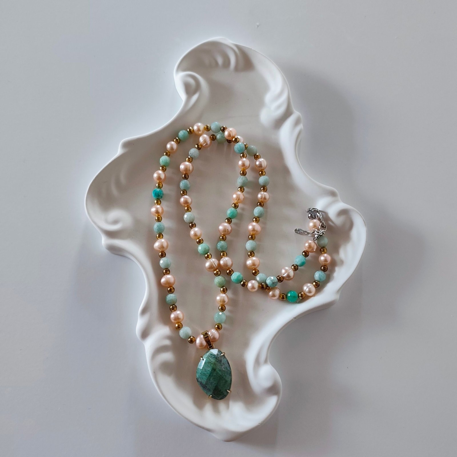 Bu zarif ve şık kolye, doğal taşların güzelliğini ve şifalı enerjisini bünyesinde barındırıyor. Amazonit ve inç detayları kolyeye göre bir görünüm kazandırırken, yeşil kuvars pozitif olarak faydalanılmasına yardımcı oluyor.
