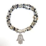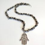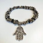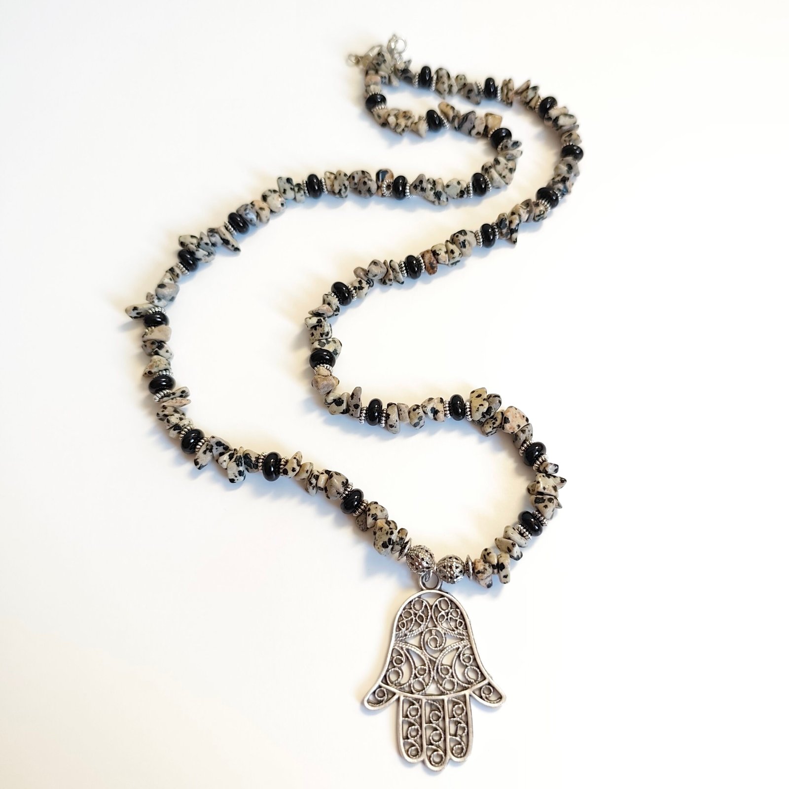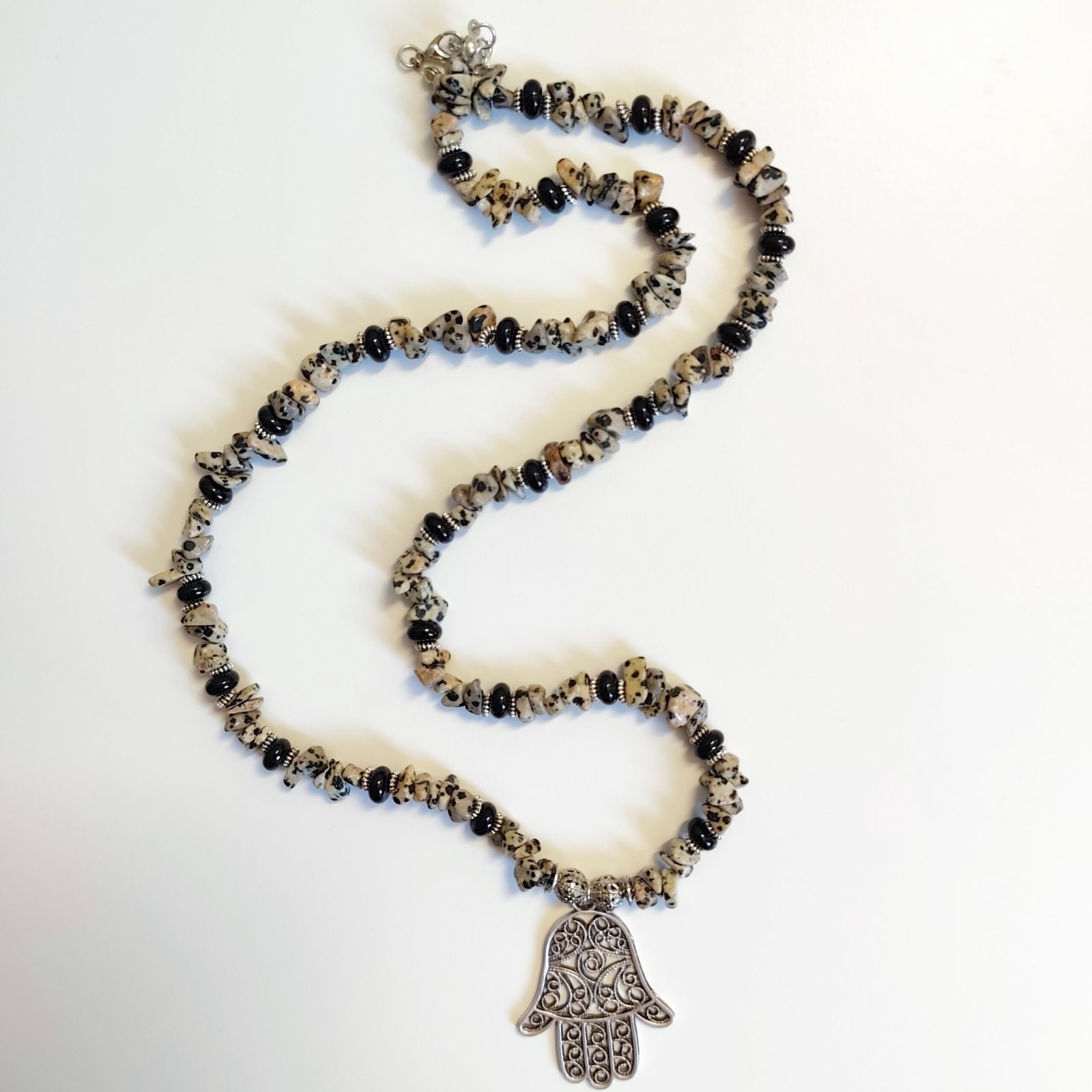 This handmade necklace, designed with Dalmatian Jasper stones and the Hamsa Hand symbol, is both elegant and protective. Dalmatian Jasper stones provide peace and balance and are also known as a lucky stone. The Hamsa Hand symbolizes protection from negative energies and enhances spiritual strength. Finished with silver details, this necklace is an elegant and meaningful piece of jewelry.