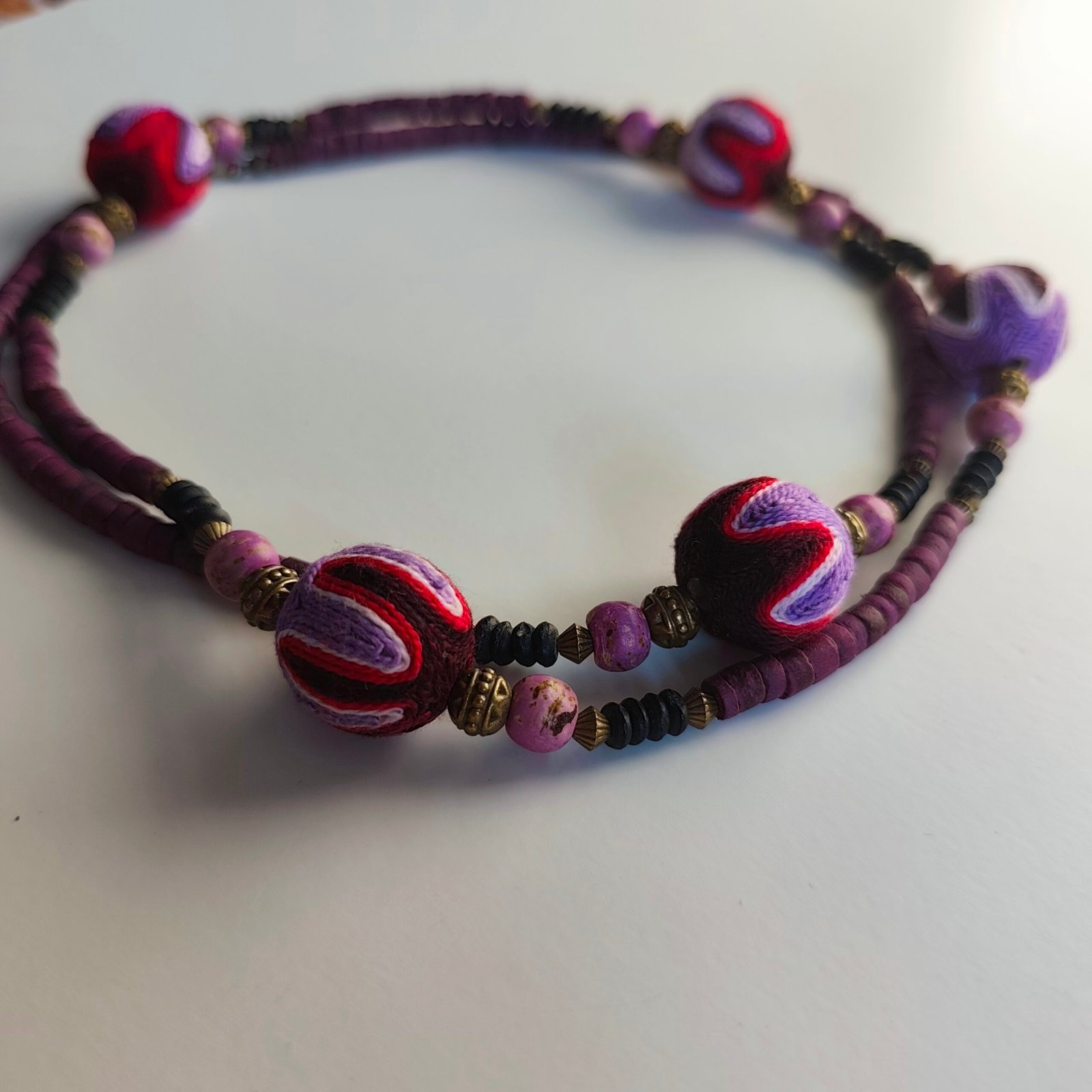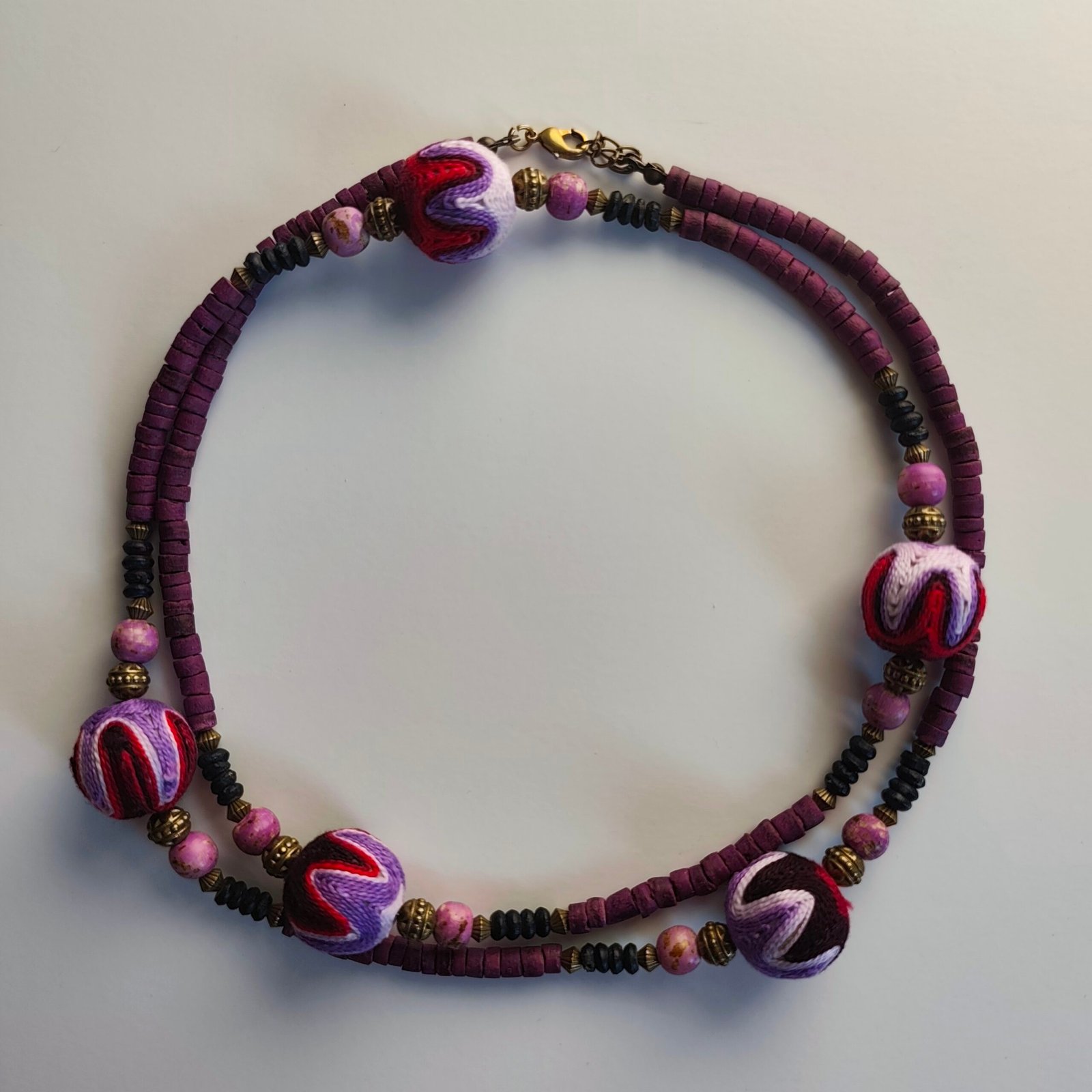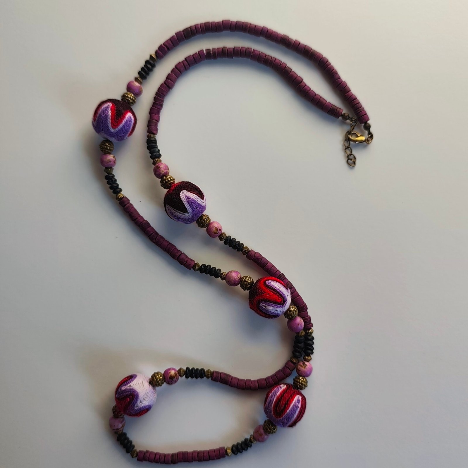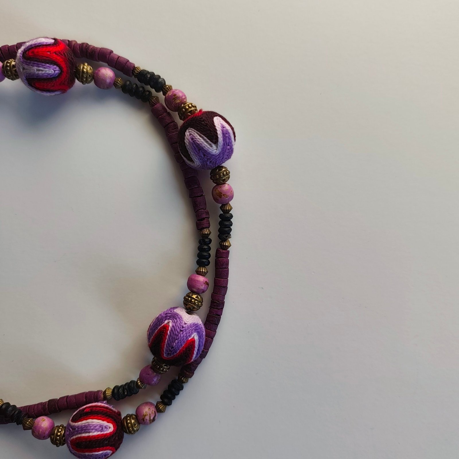 Colored Stones and Embroidered Beads: The necklace is adorned with stones in vibrant purple, red, and black hues. The embroidered beads are an elegant example of traditional handcrafting.
