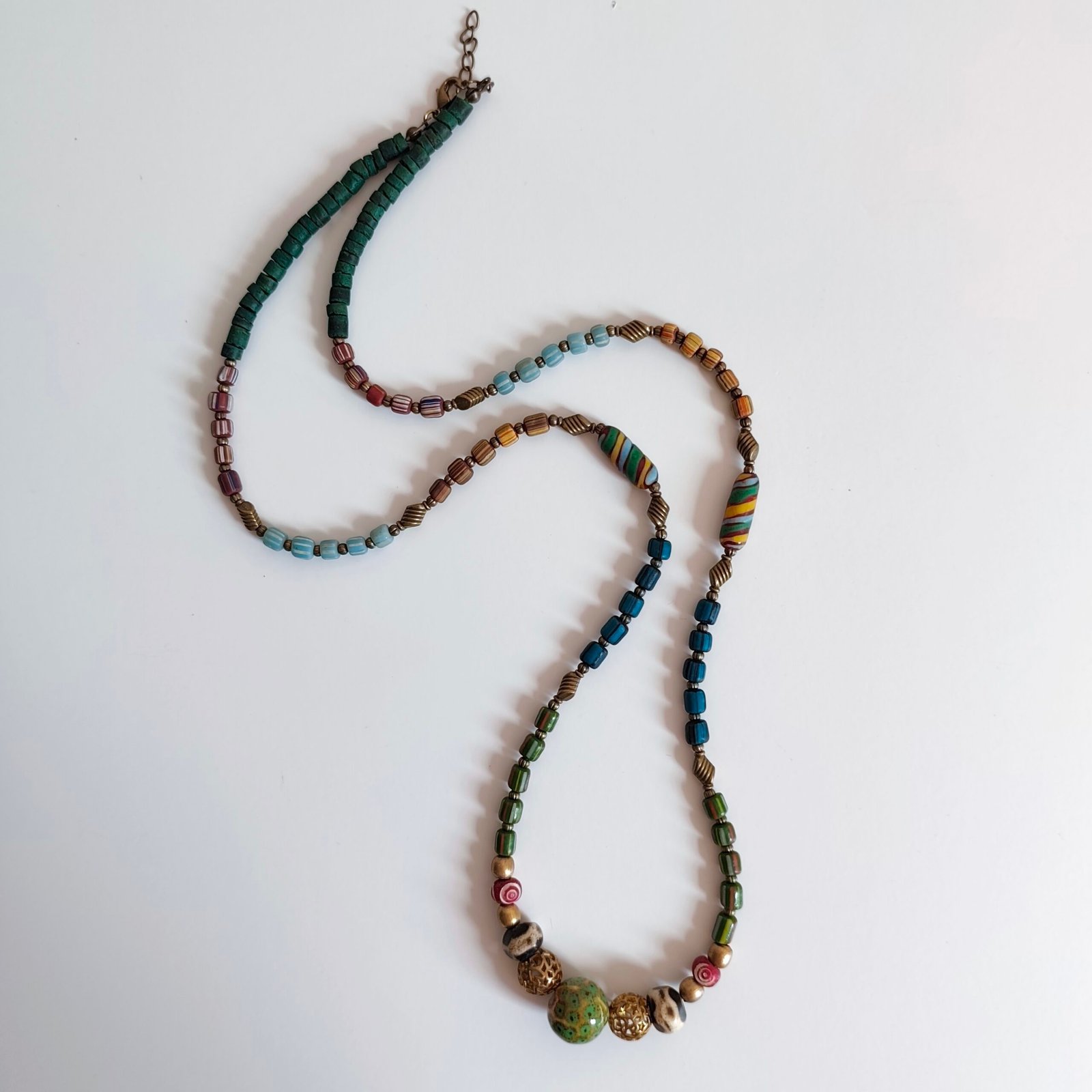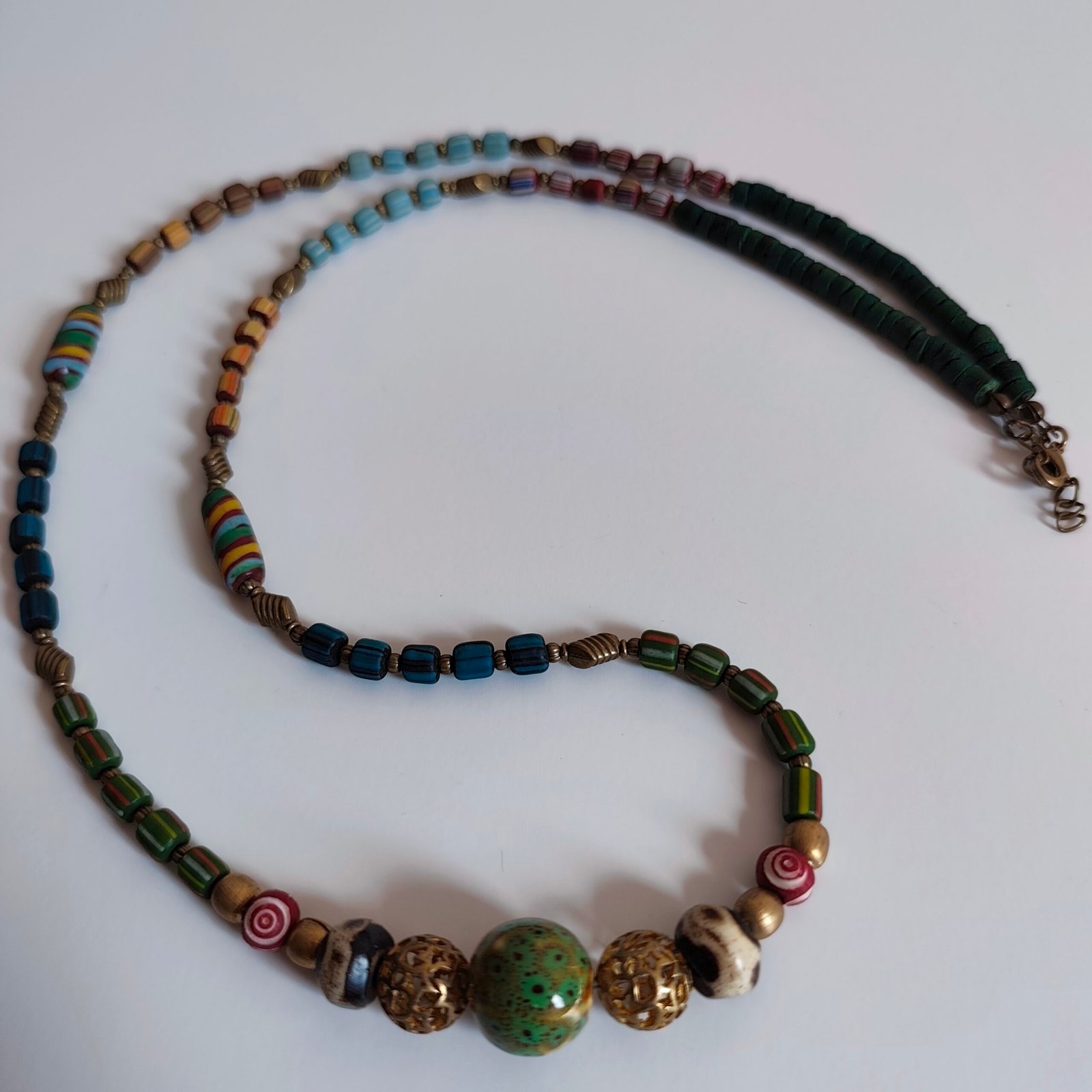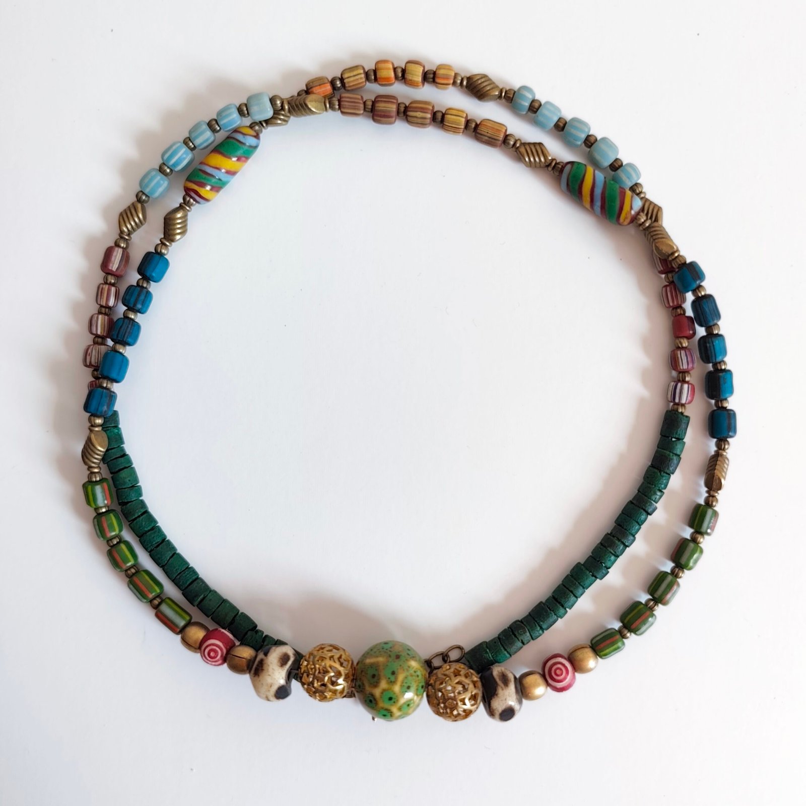Colorful Beaded Bohemian Handmade Necklace with Wood and Metal Details