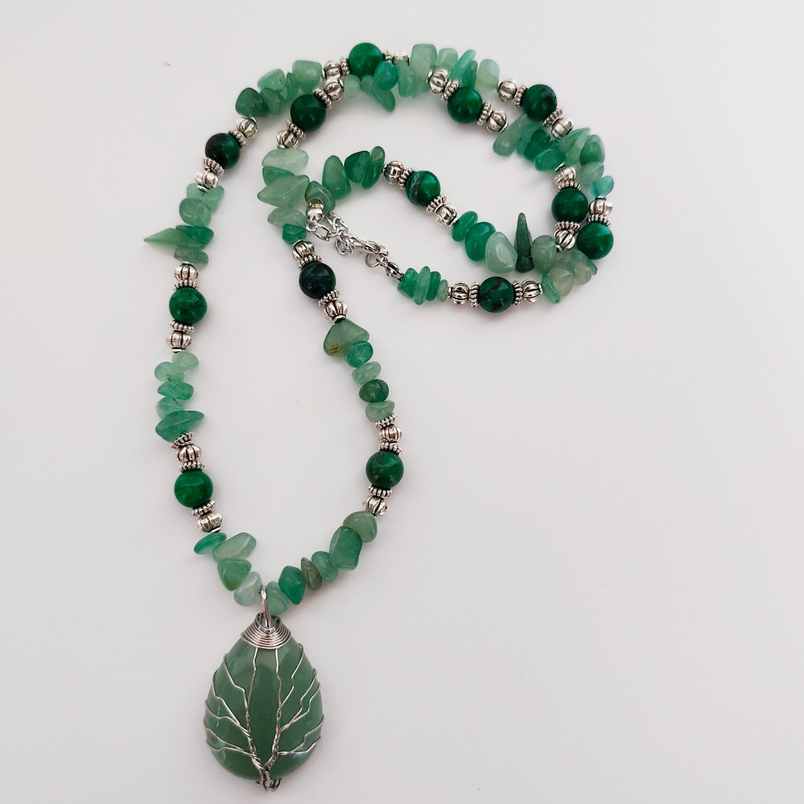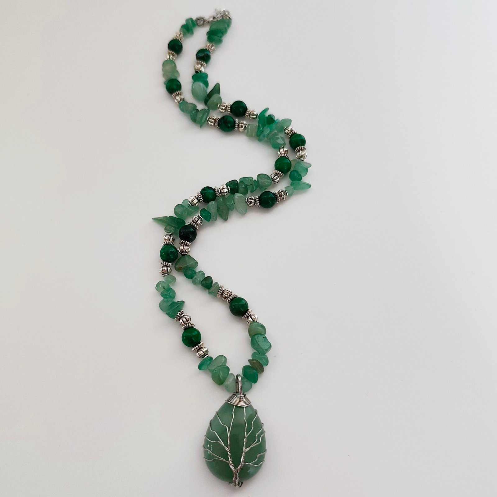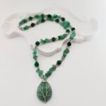 This handmade necklace, designed with an elegant combination of Aventurine and Malachite, embodies the energy and healing power of nature. The green crystal stone on the pendant is surrounded by a tree pattern, symbolizing balance, healing, and protection. You can both feel the power of natural stones and own elegant jewelry.