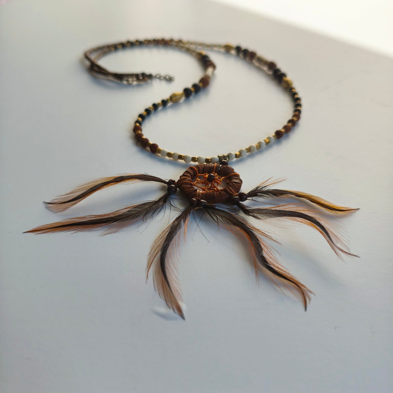 This shamanic-style necklace features elements that symbolize harmony with nature and spiritual balance. The dream catcher symbol is used to ward off bad dreams and attract positive energy. Designed with wooden beads, natural stones, and feather details, this necklace is a mystical accessory with shamanic meaning.