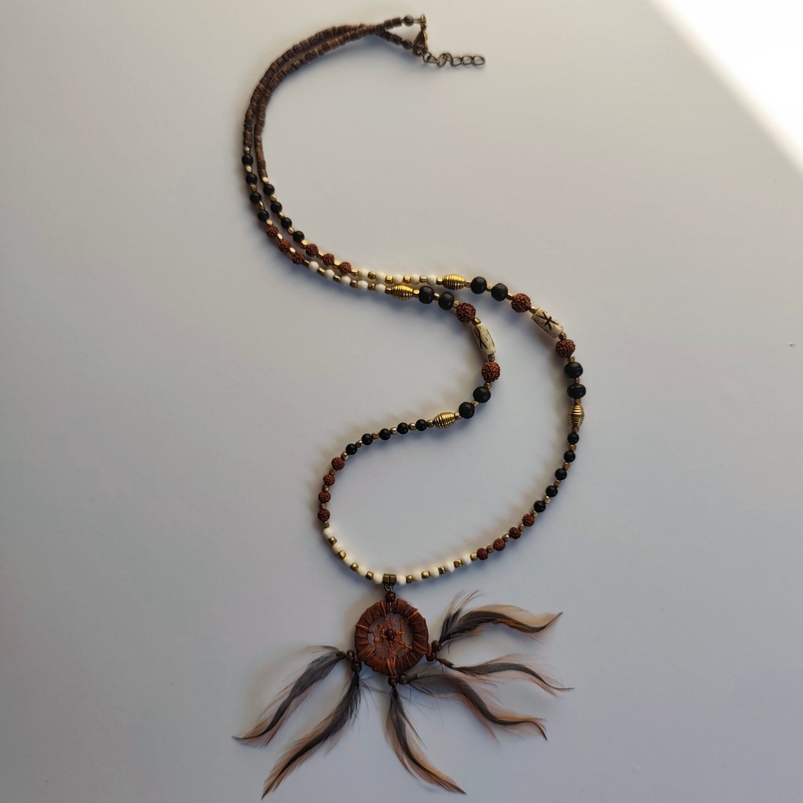 Shamanic Style Handmade Dream Catcher Necklace with Wooden Beads and Feather Details