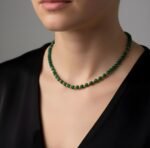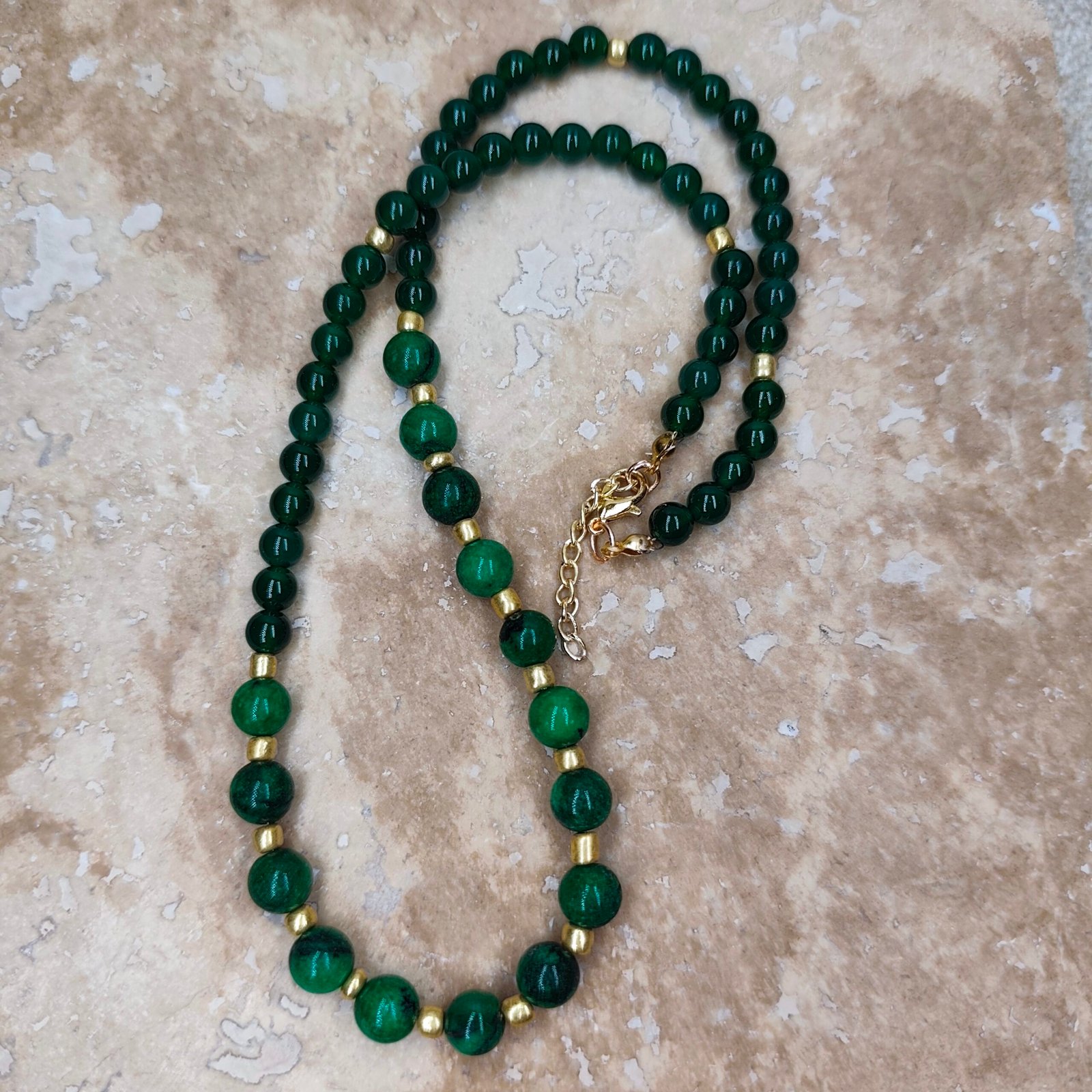 This elegant necklace is designed using malachite beads. Malachite stands out with its deep green color and unique patterns. The vibrant shades of green add an energetic touch, while the gold-plated beads add elegant contrast. Malachite is believed to be a stone of luck and balance, adding not only aesthetic value but also meaningful value to the necklace. It’s a perfect choice for both everyday wear and special occasions.