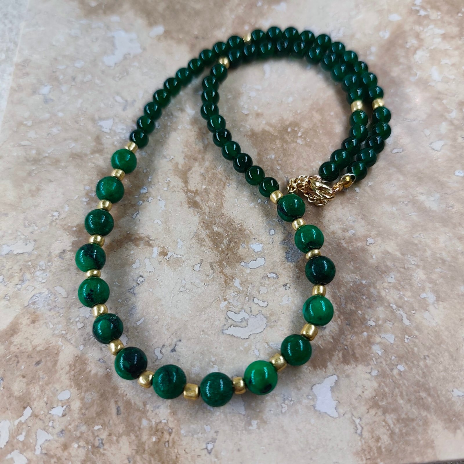 Malachite beads add vibrancy and energy to the necklace.