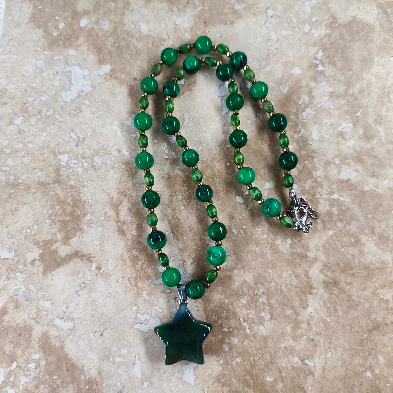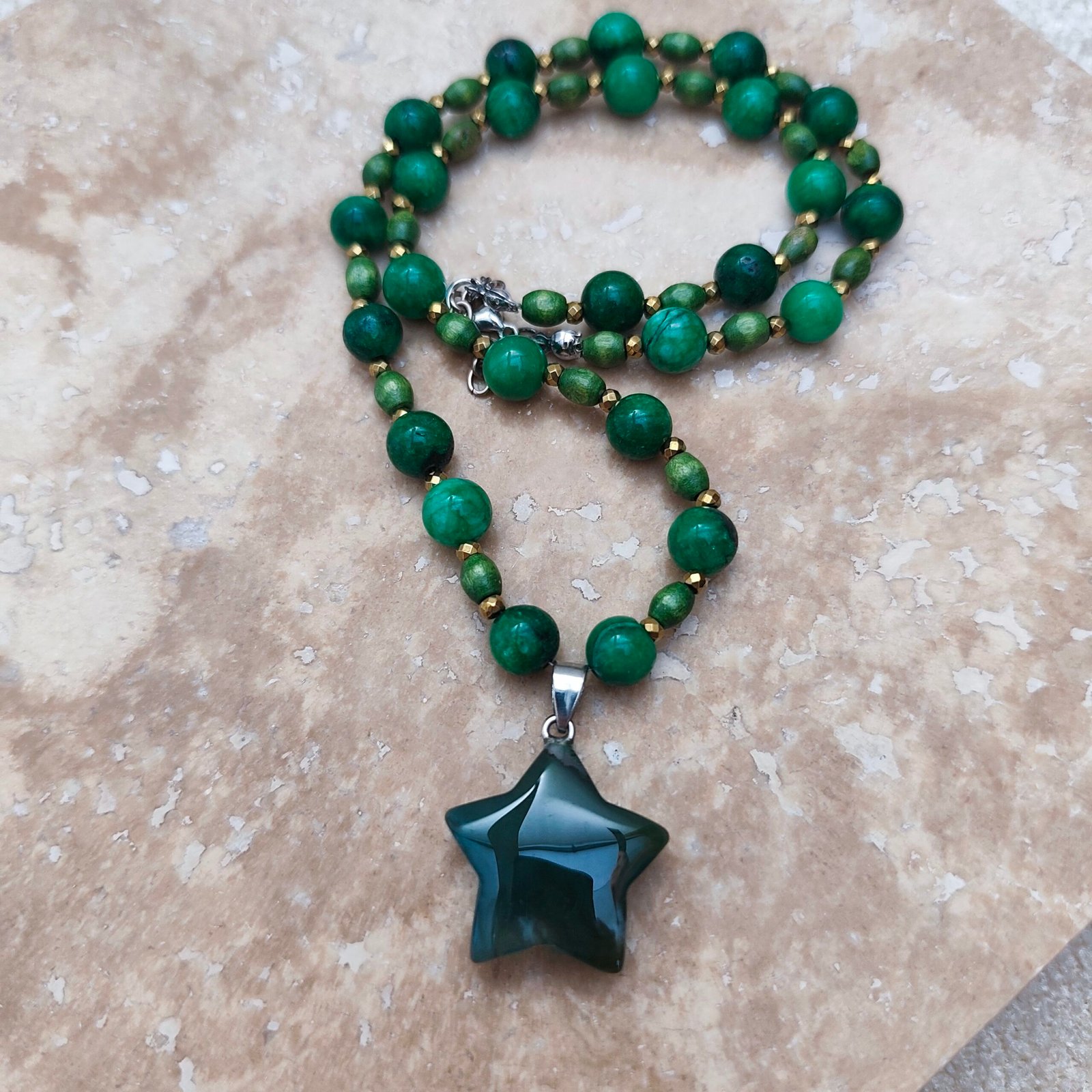 Designed with the energy of natural stones, this elegant necklace stands out with its elegance and healing properties. The harmony of Green Malachite and Aventurine is both eye-catching and helps maintain energy balance.